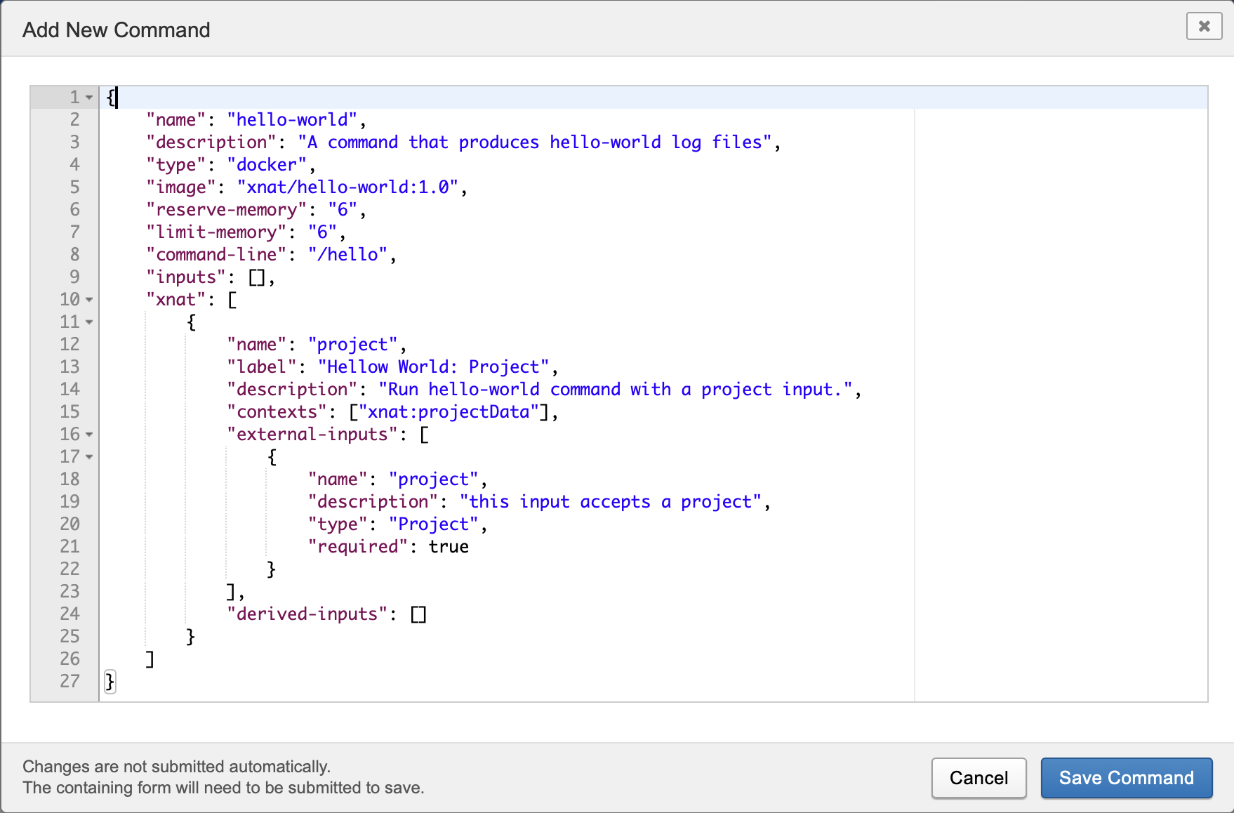 Paste your Command's JSON definition into the editor window. For instance, in this screenshot we have pasted the xnat-hello-world Command JSON.