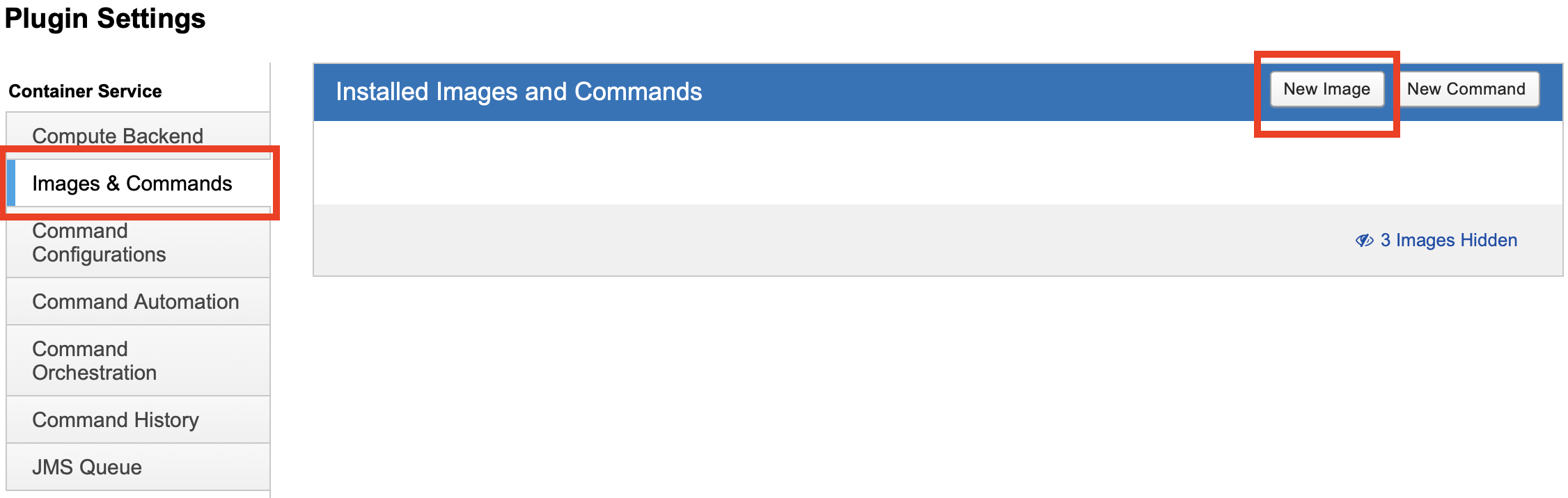On the Plugin Settings page, choose Images & Commands. Click the New Image button.