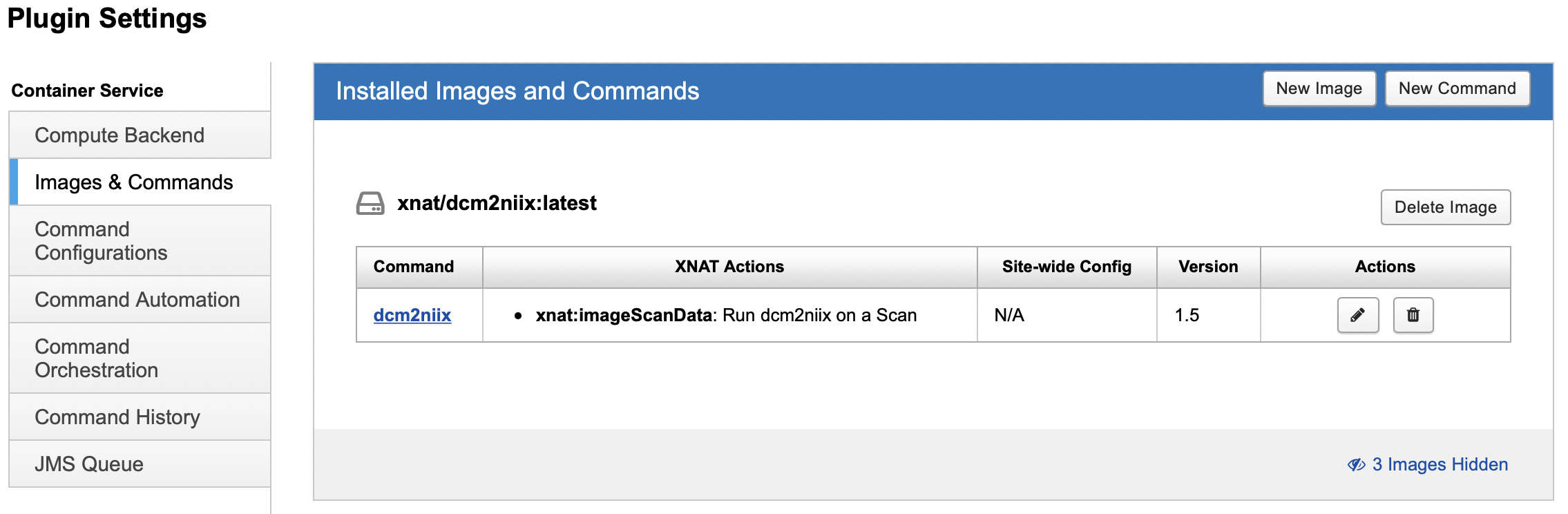 On the Images & Commands screen, you should see your newly associated command and image listed. Note the XNAT Actions column, which shows each command's launch context. This one is designed to launch at the Project level, according to line 15 in the Command JSON.