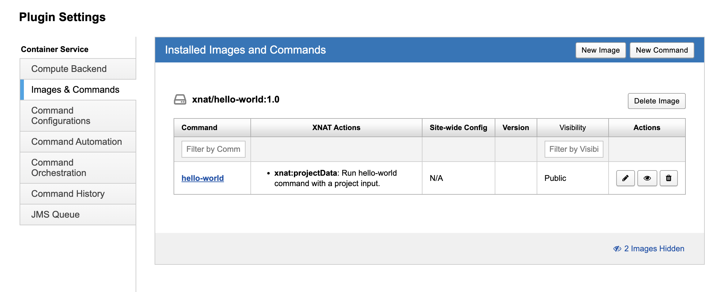 Once the image has been pulled to your compute backend, the Container Service will read the Commands from the image's labels. The Images & Commands screen will show the image and its associated commands.