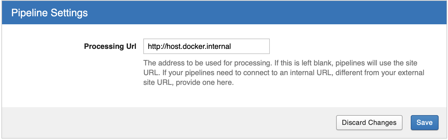 However, sometimes you want or need a different URL to be used for processing (including pipelines and containers). Maybe your external Site URL is slower and more locked down, but you have a faster connection on a different URL that can be used on the internal network where processing runs. Or maybe you’re using the xnat-docker-compose project. In this case, your XNAT is accessible on your host machine at localhost, but that same address inside a container just loops back to itself and doesn't connect out to the host.