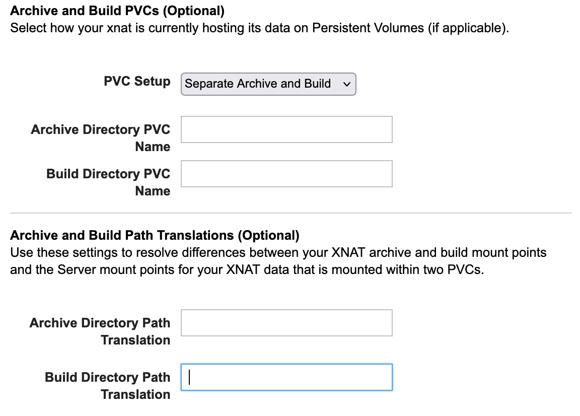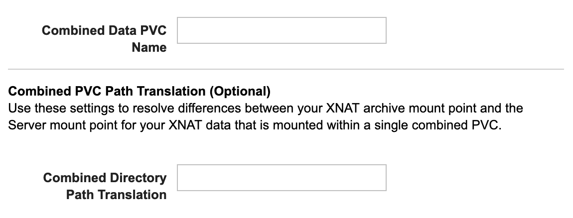 Additionally, you will need to fill in the Path Translation fields with information about the location of data within the PVCs. This is very similar to performing path translations for XNATs hosted without PVCs and you must simply input the paths within the PVCs where data will be located. So if data within your archive is located at ‘/xnat/data/archive/{data-folder}’ the path translation should be ‘/xnat/data/archive/’.