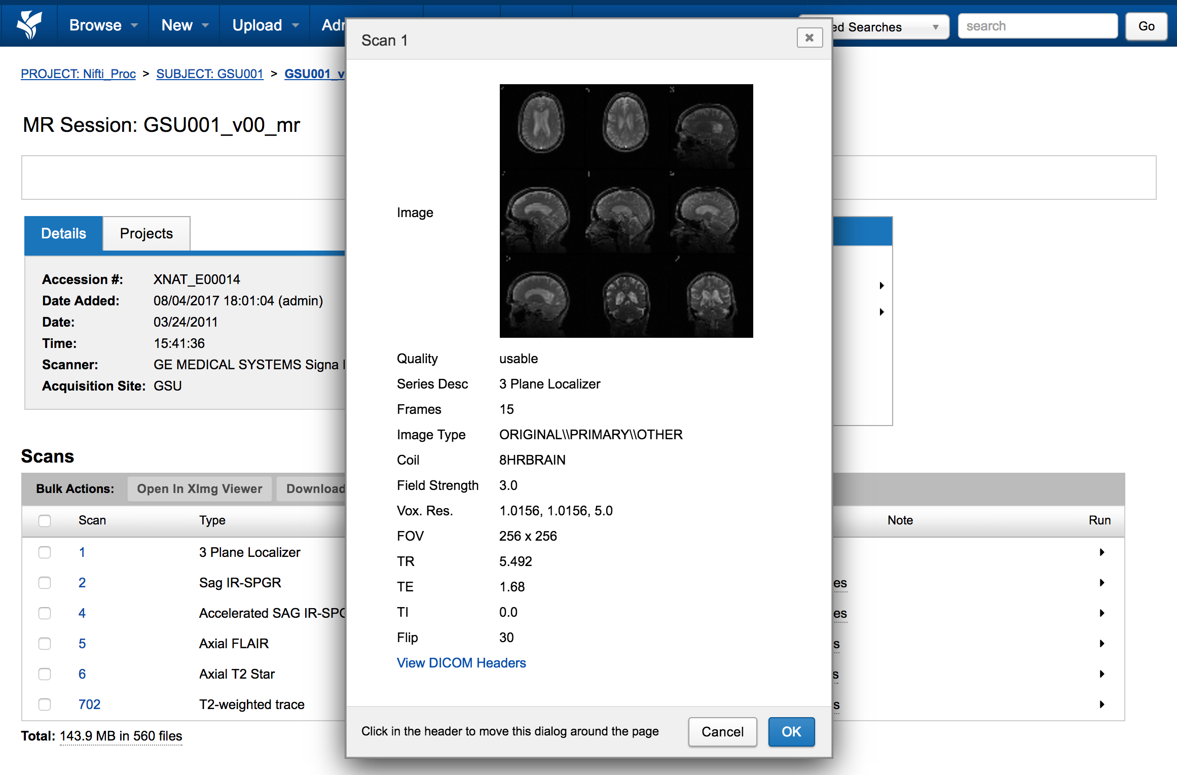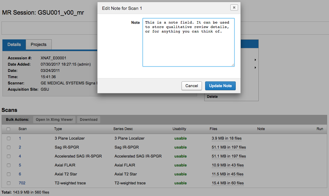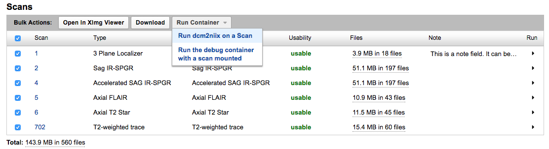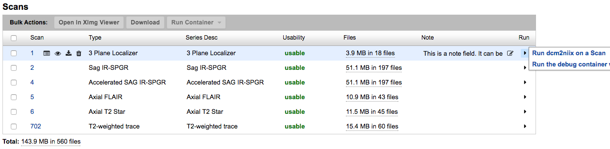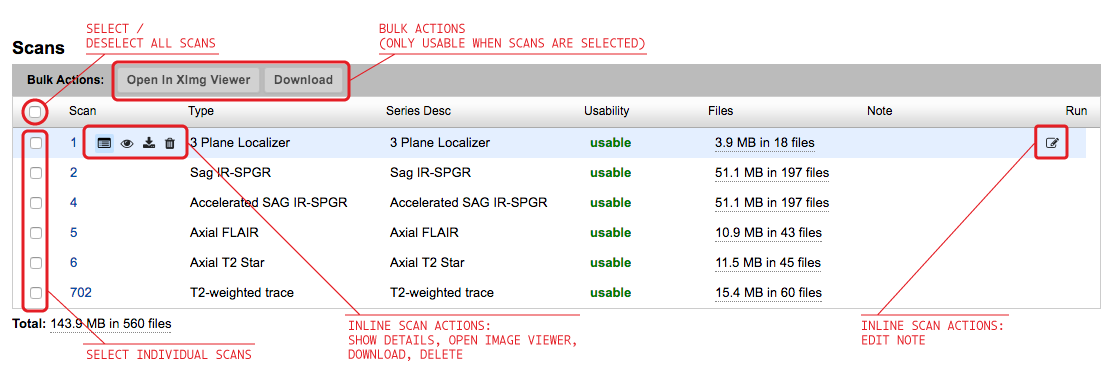 The advent of Container Services gave XNAT users the ability to run a processing command on a single scan, but the XNAT UI offered no way to access scan-level controls. The Selectable Table plugin was developed in order to expose those controls to users, but it also offers some basic conveniences for core XNAT uses. This documentation offers a quick run-through of the things you can do from inside this table, both on individual scans and in bulk.