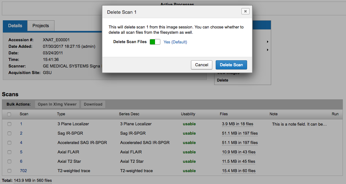 Users with appropriate project permissions will be see the "delete" icon in their inline actions and be able to delete a given scan from a session record, and delete scan files from the file system, directly from the scan table.