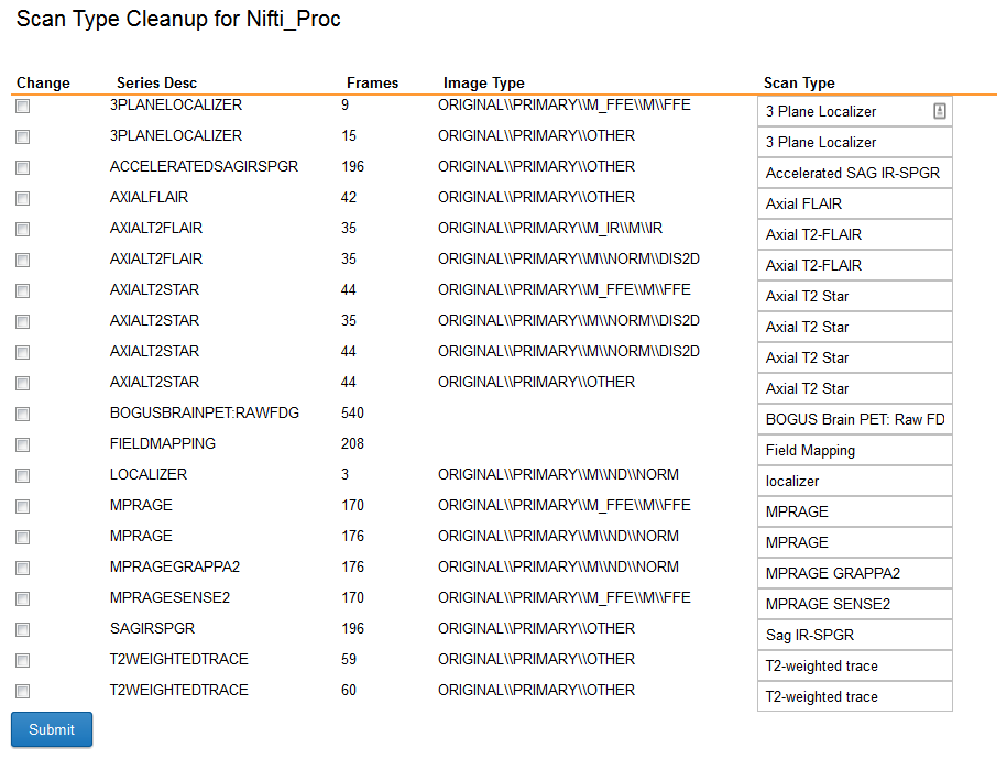Scan type harmonization can be an important factor when comparing data across multiple studies. There are times when the fine-grained distinctions between scan types as they are named by the scanners are important, but there are also times (e.g. "T1" vs "MPRAGE" vs "Structural") when these are distinctions without a difference. Even small changes, such as capitalization or the usage of hyphens in scan type naming, will generate unnecessarily duplicative scan label entries in XNAT.