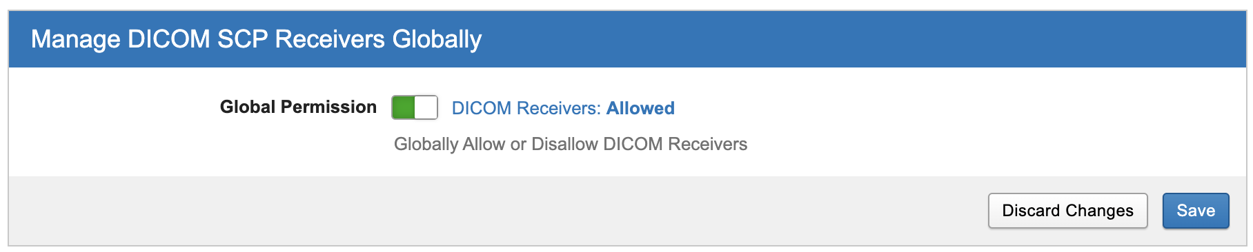 At a site-wide level, an XNAT Administrator can control whether or not to receive DICOM data via SCP. Go to Administer > Site Administration > DICOM SCP Receivers to toggle this setting, which is set to "Allowed" by default.