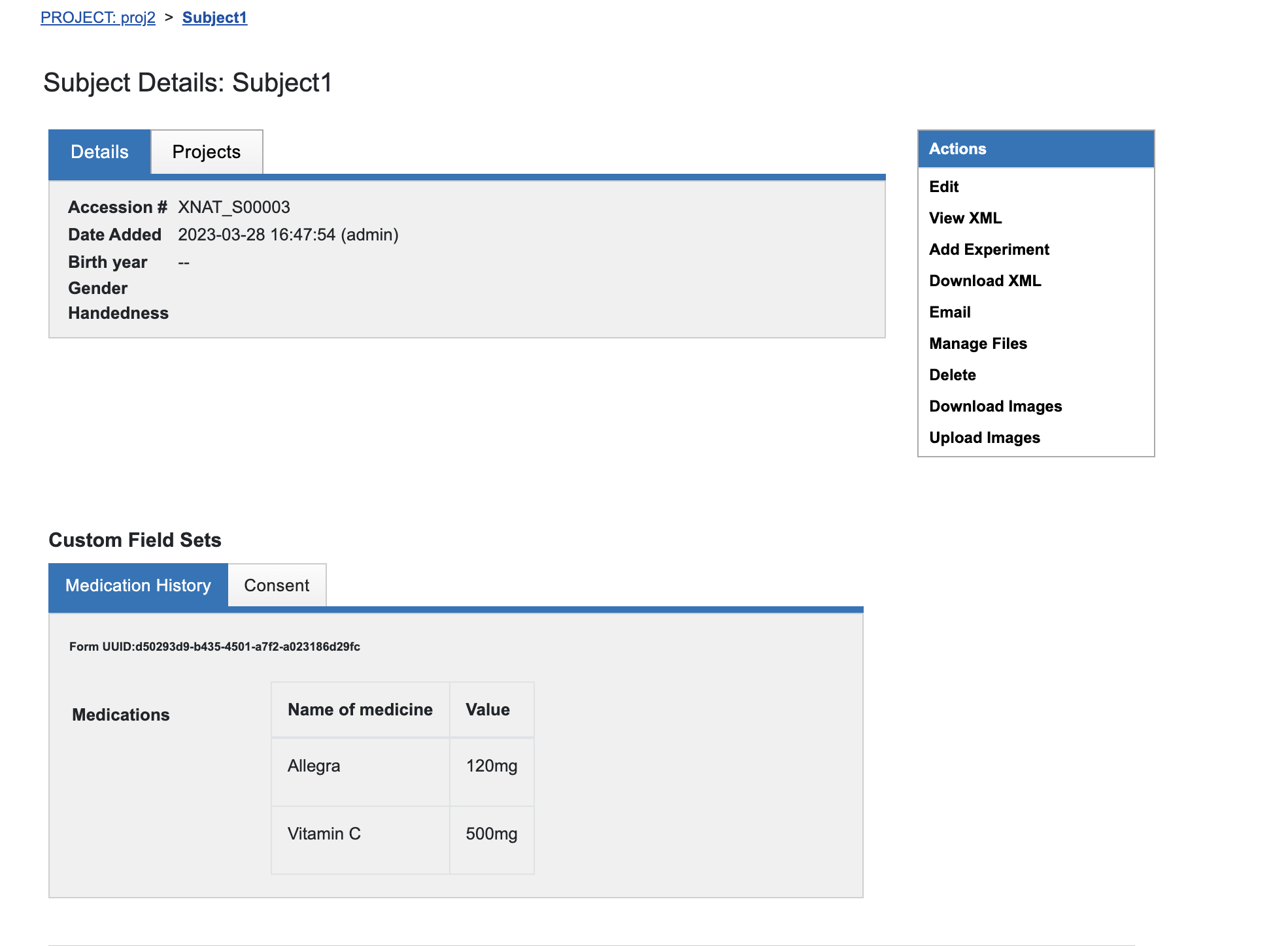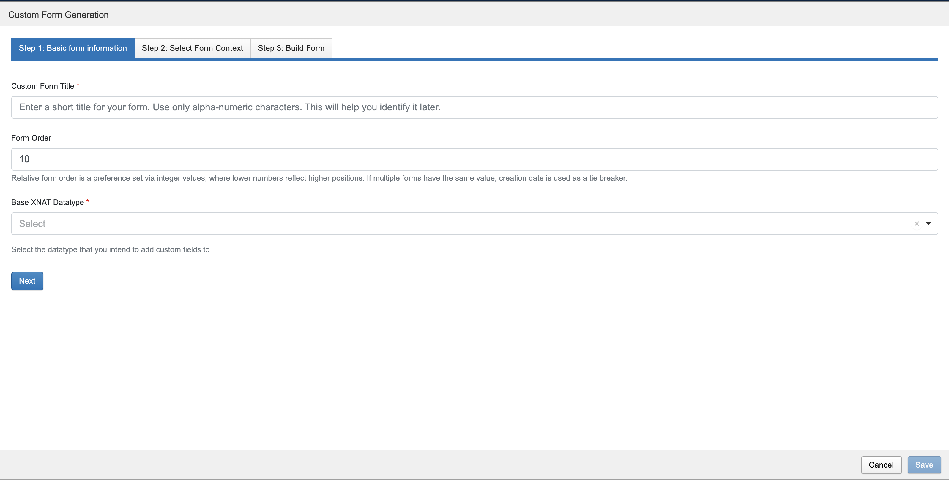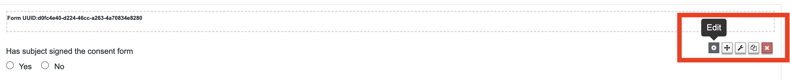 Each form saved is assigned a universally unique identifier (UUID) by XNAT. The uuid of the form is displayed on the form dashboard below the form title. Once the form is saved, users can enter form data when creating a new entity for the datatype.