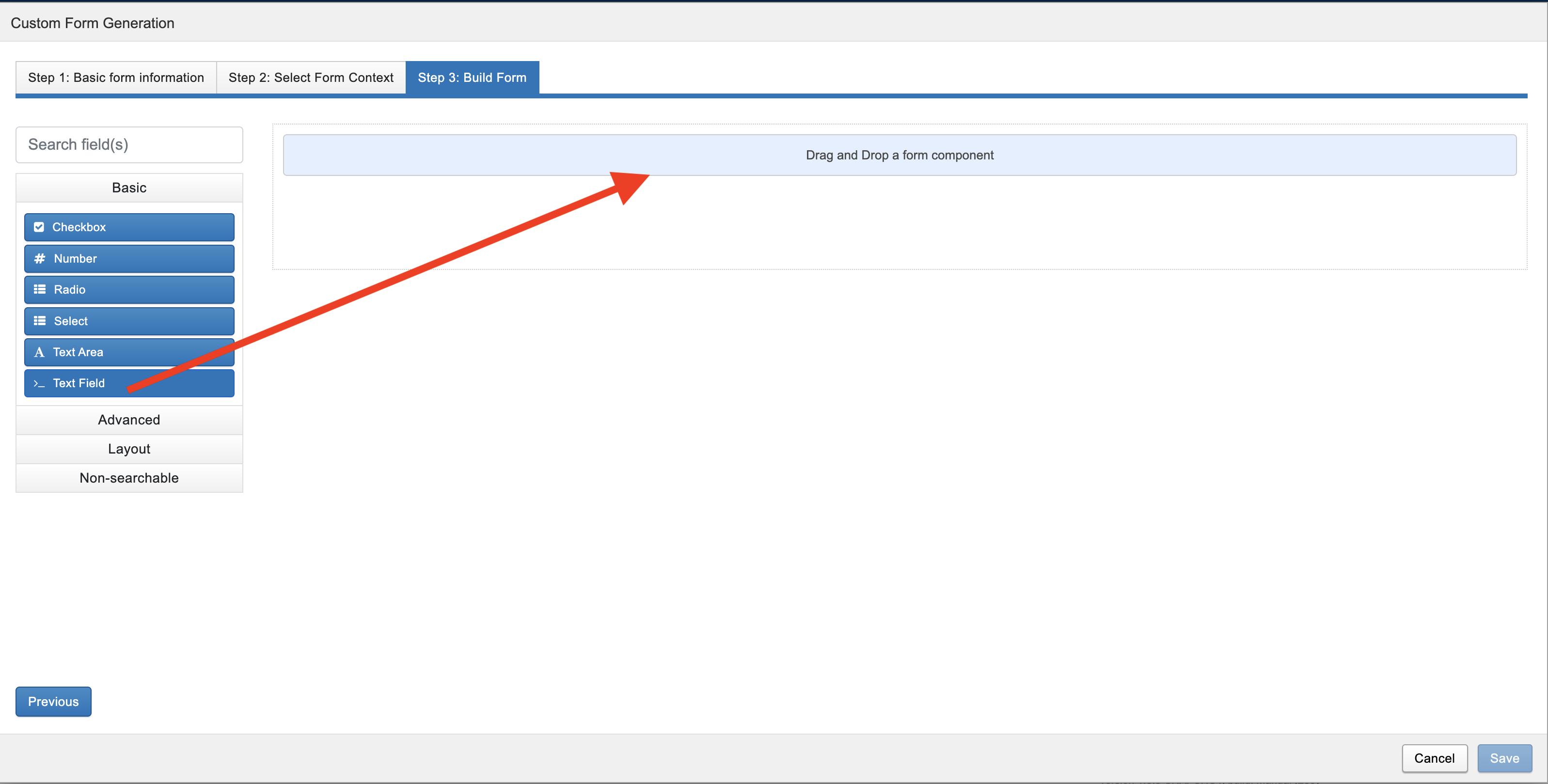 You can drag and drop a form component to start creating the form definition (aka form schema).