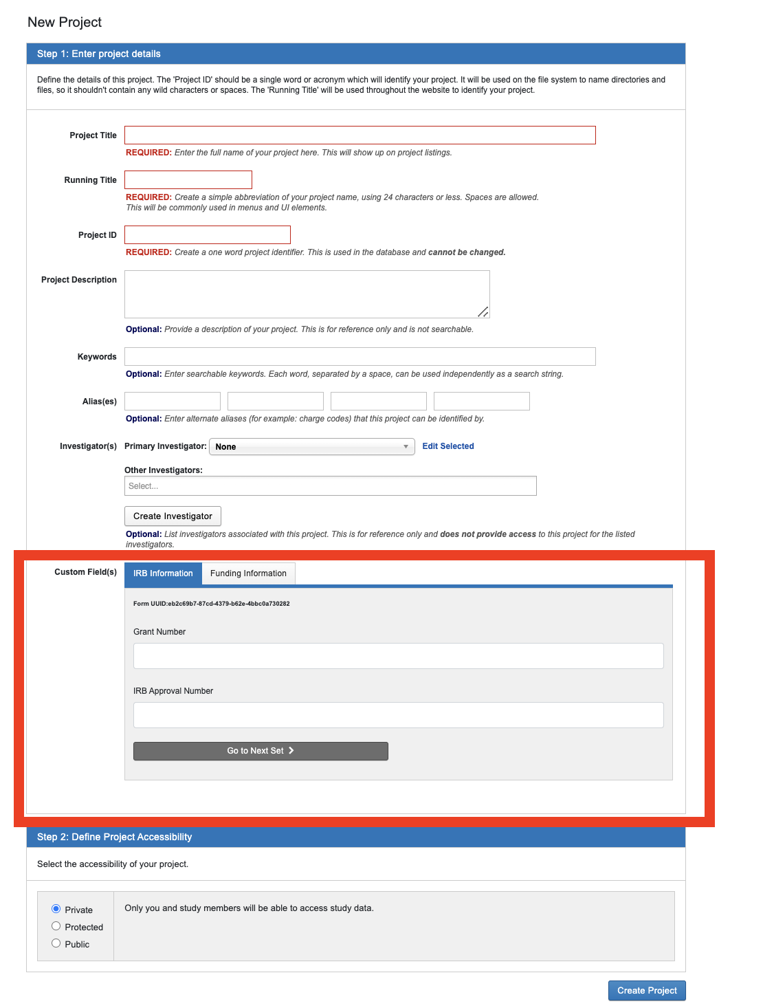 Form data can be entered while creating a new project.