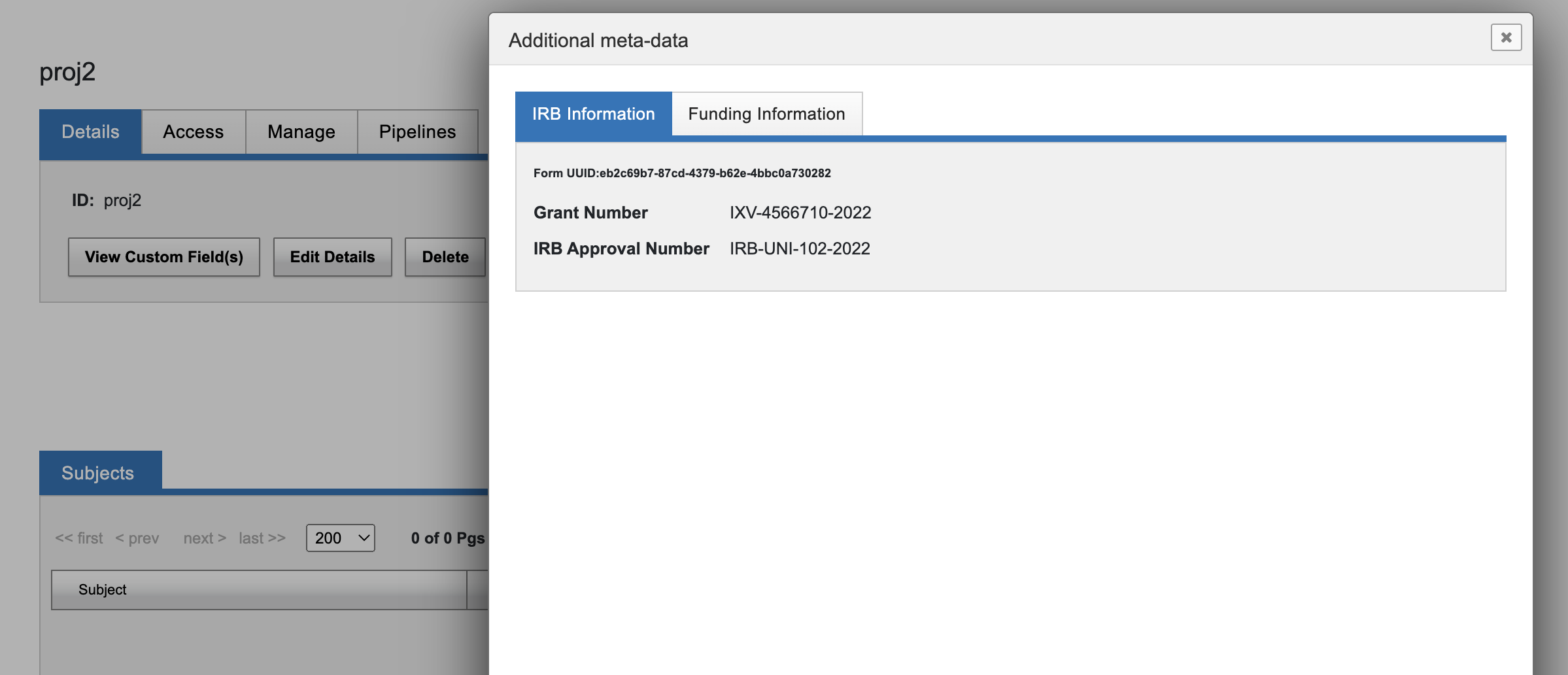 Form data for a project, can be edited using Edit Details on the Details tab of the Project report page.