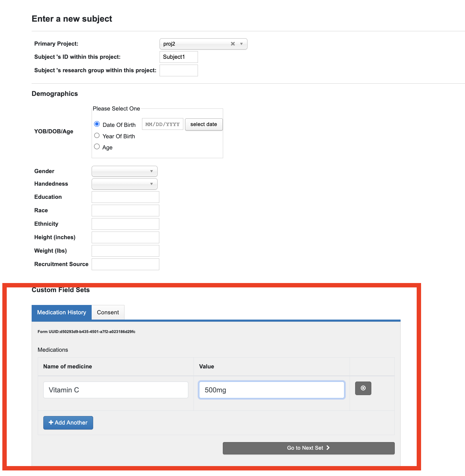 Form data can be entered while creating a new subject or an experiment.
