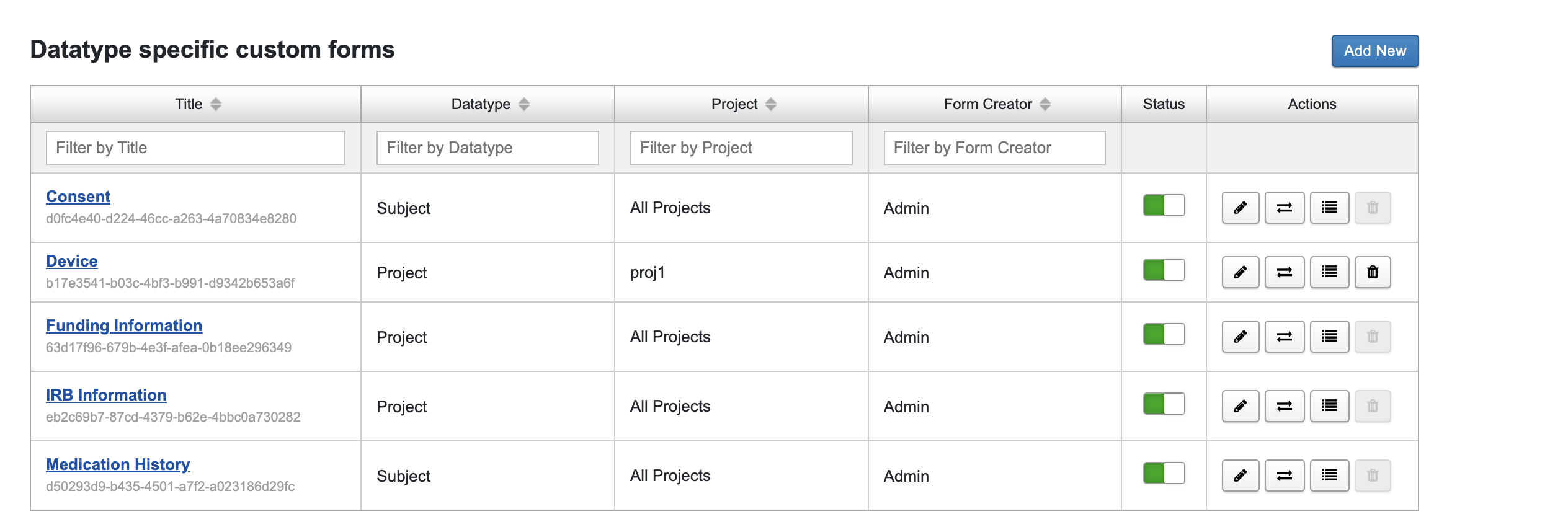 The form management dashboard displays forms available in a XNAT instance. The dashboard contains information about a form, the datatype it applicable to, its scope, the form creator and actions that can be performed for a form.