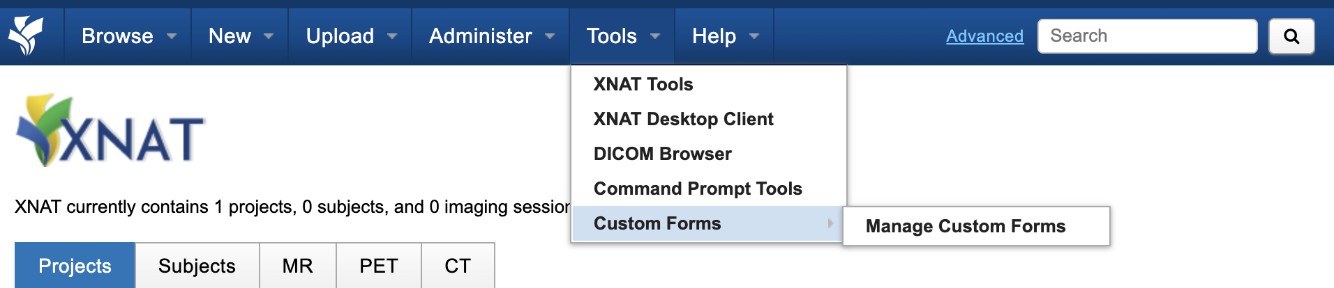Login to XNAT as a Site Admin or as a Custom Form Manager user. Navigate to Tools → Custom Forms → Manage Data Forms.