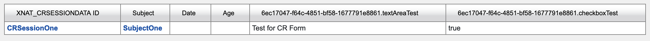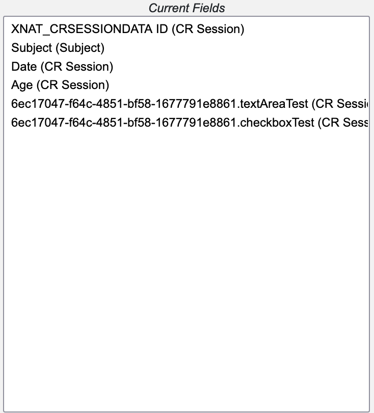 As can be seen in the listing above, when shown in the edit columns menu, the individual column listings will be shown as custom forms listings by the inclusion of the form's UUID along side their field name and datatype. This allows you to know which fields are custom forms fields and what form each field is associated with. As with non-custom forms columns, you can add one of these columns to a search listing by selecting the column from the list and clicking the left pointing arrow to add that column to the 'Current Fields' section.