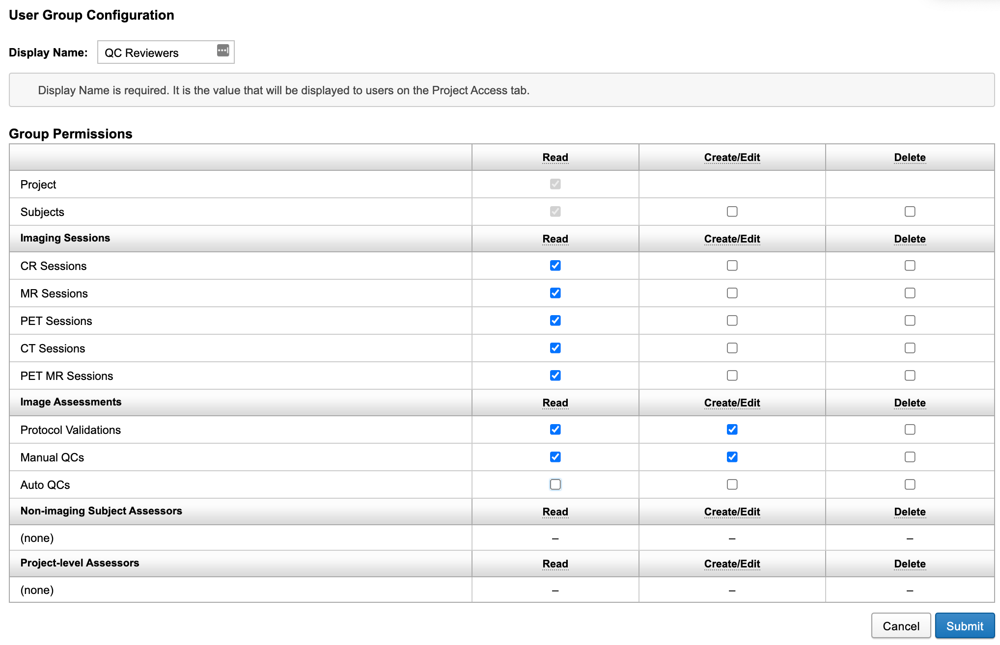 Without those permissions, no other data access could be granted. After that, all other read/write/delete data access can be toggled on or off. So, for our "QC Reviewer" example, we would want to give them "Read" access to every type of image session, and "Create/Edit" access to Manual QCs and Protocol Validations. (The Project Owner may also decide to grant "Delete" permissions to allow them to clean up their own work.)