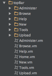Each VM file, such as Administer.vm, contains a menu item and a second Velocity macro to parse the contents of its related subdirectory, like so: