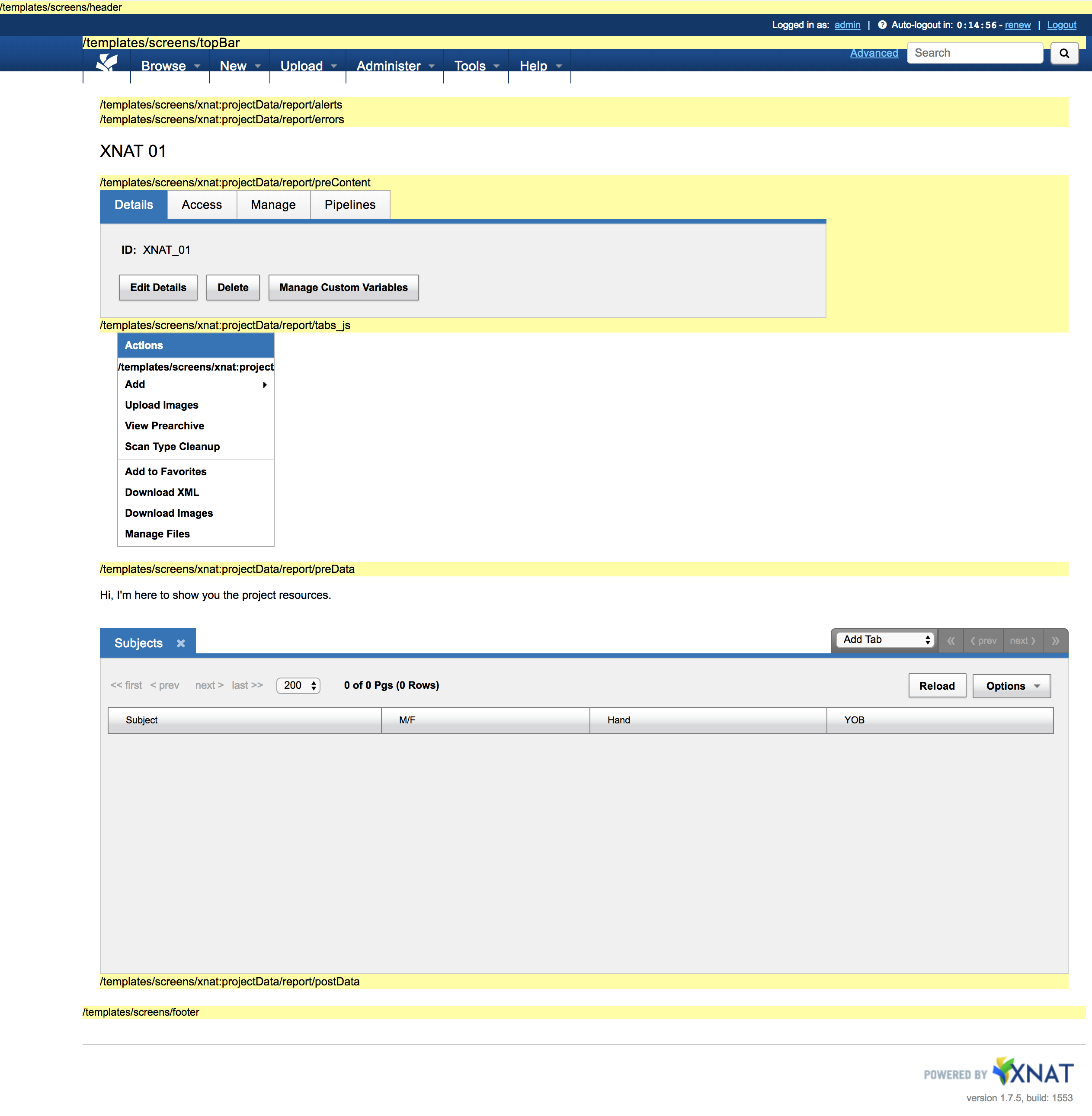 The screen shot below shows XNAT with debug extension points displayed, with a file placed in the path templates/screens/xnat_projectData/report/preData/project_resources.vm that displays a simple message.