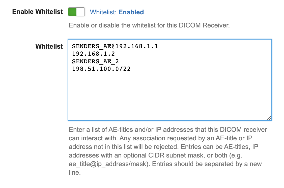 The whitelist setting (introduced in XNAT 1.8.5) allows you to configure a list of AE Titles and/or IP Address that the DICOM SCP Receiver is allowed to interact with. When the whitelist is enabled, only entries in the whitelist will be allowed to make a connection to the receiver. Entries in the whitelist should be separated by a newline character and can be an AE Title, IP Address, or AE Title@IP Address. CIDR mask notation is also supported to specify a block of IP addresses.