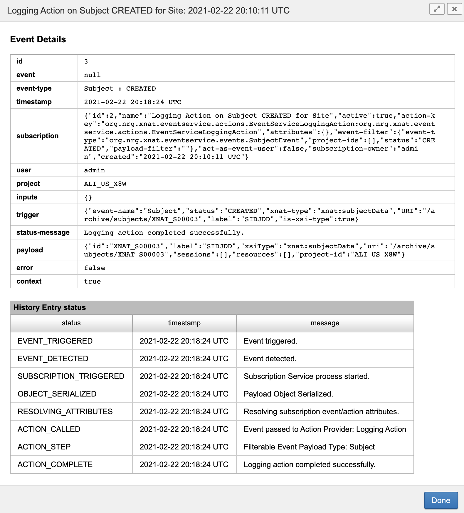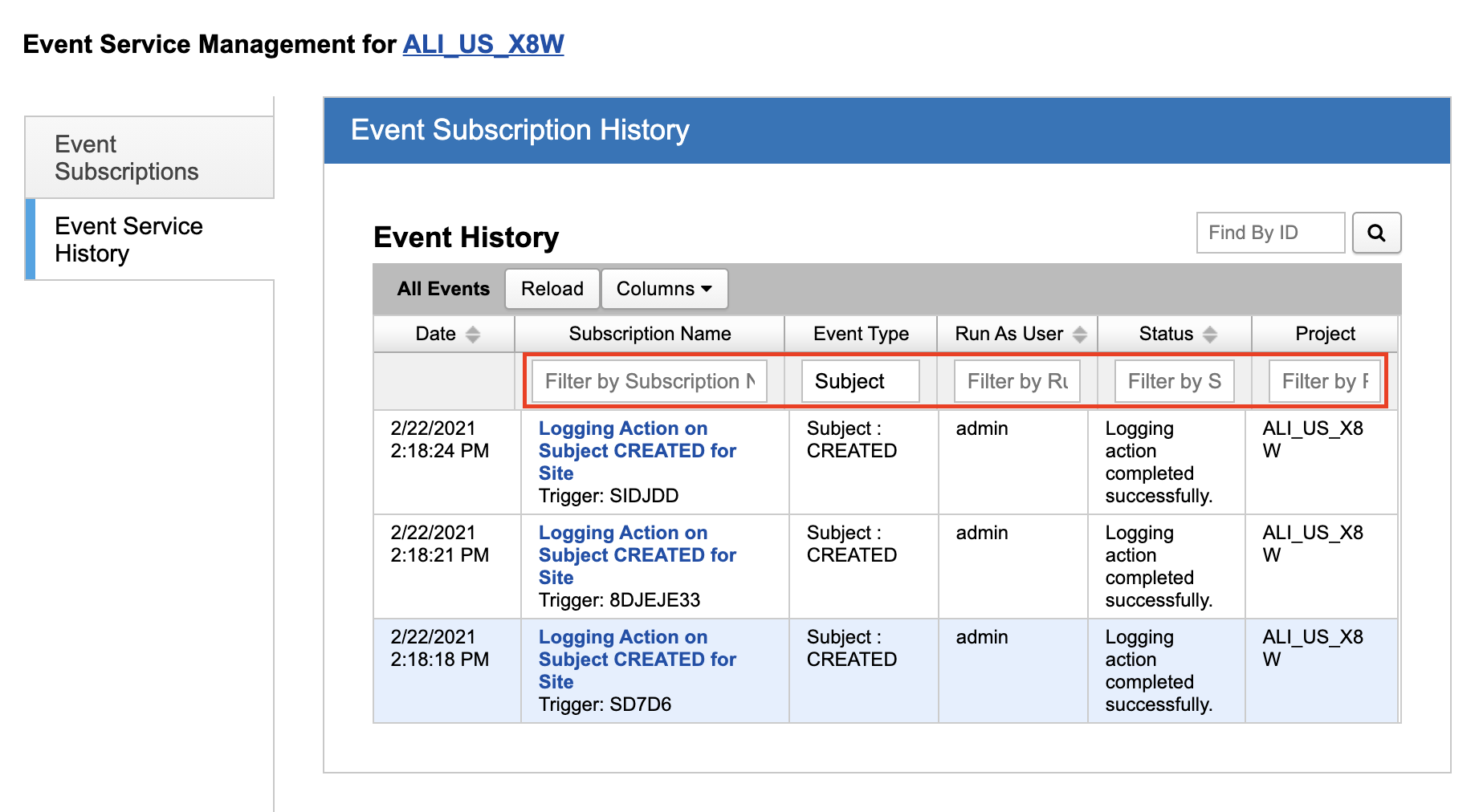 The Event Service History pages let owners and administrators to see the status of delivered subscriptions, i.e. Events with matching Subscription constraints resulting in an Action.
