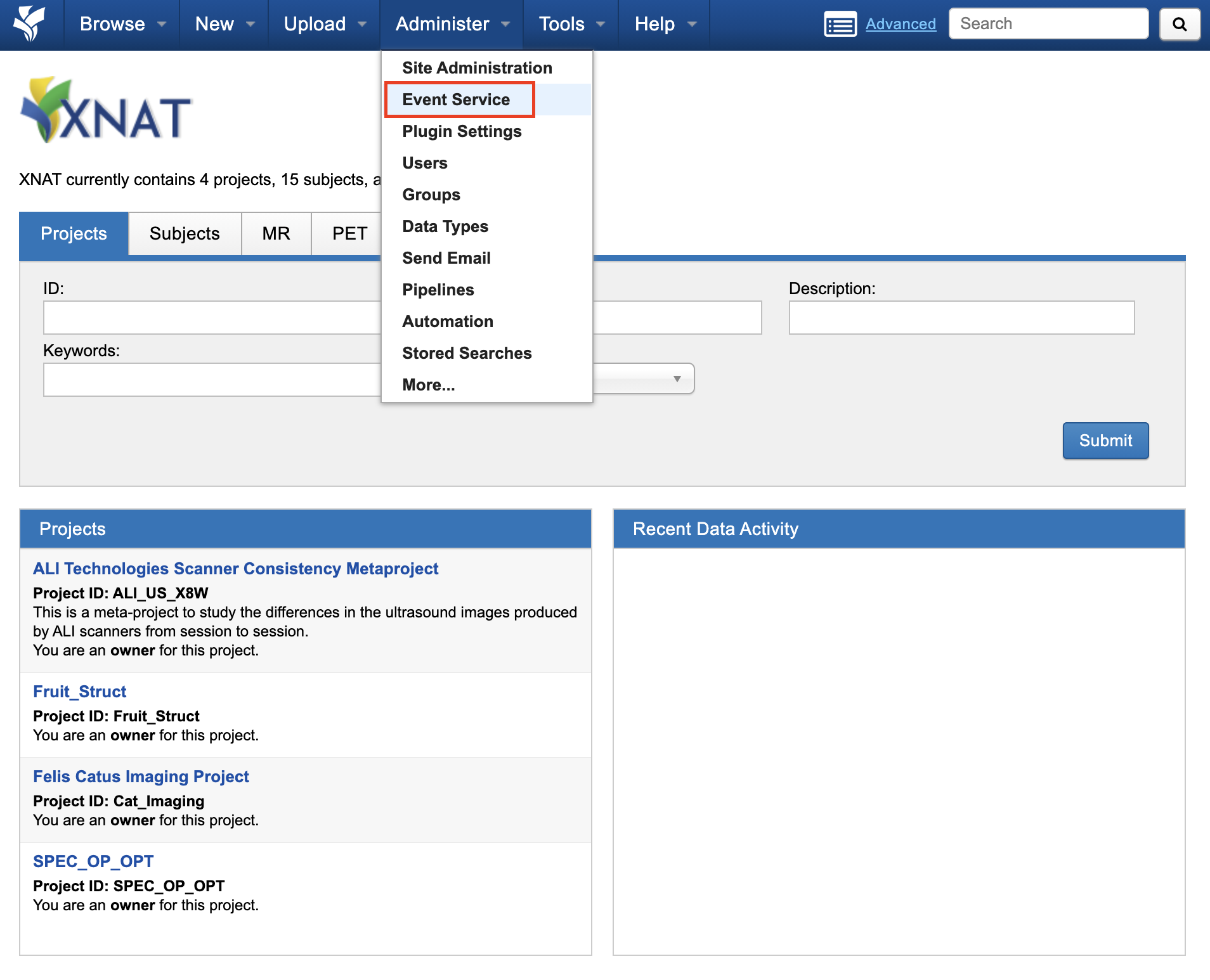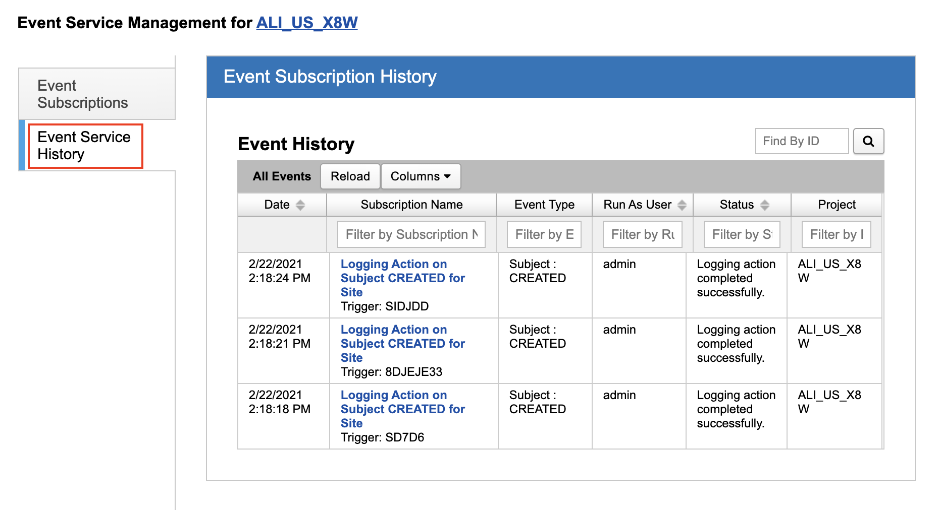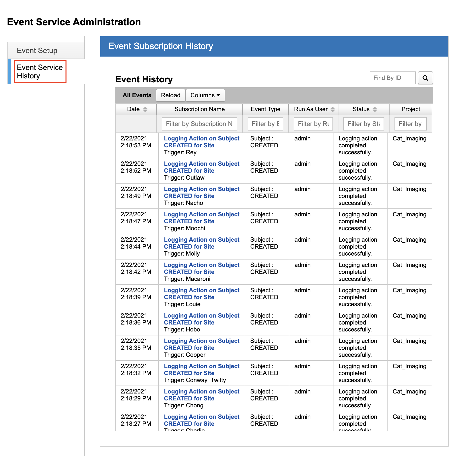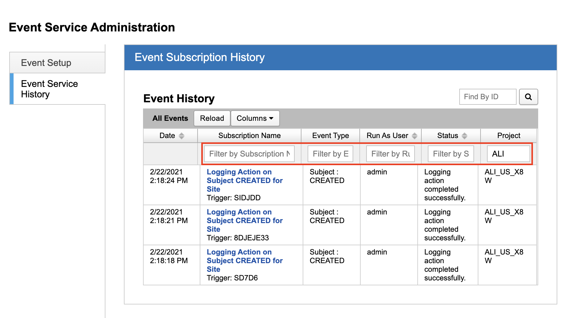 Users with Administrator level permissions can access site-wide, multi-project, and single project history listings by way of the Administrator → Event Service menu.