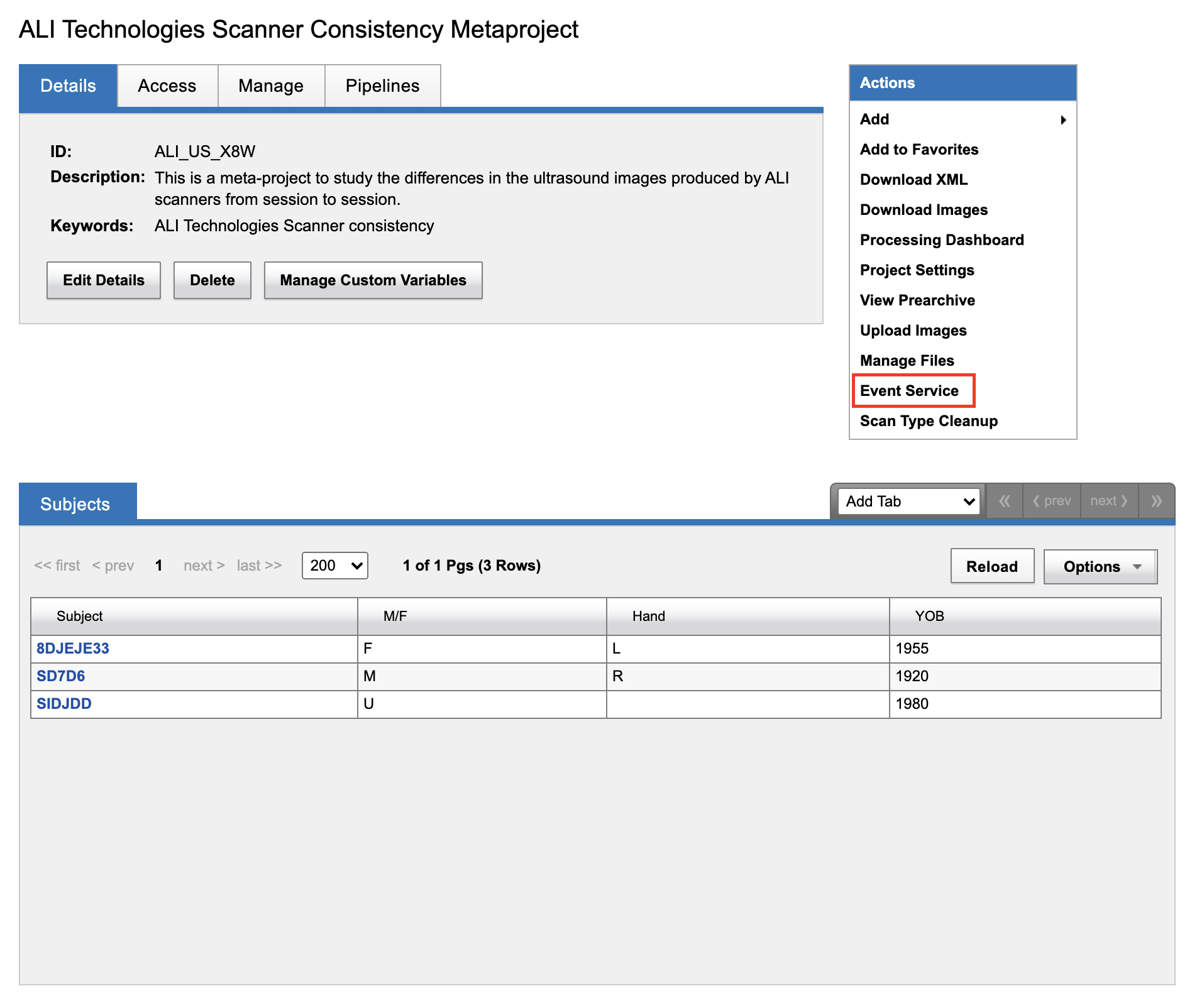 Users with Project Owner or Administrator level permissions can access project-level Event Service history listings by way of the Actions → Event Service menu on the project page.