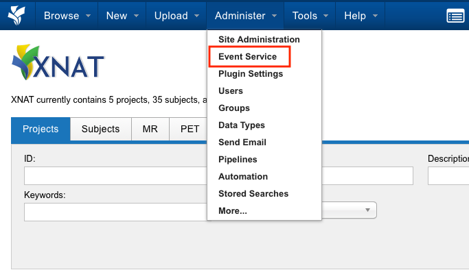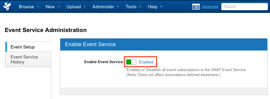 As a user with administrator privileges, browse to the Administrator -> Event Service page.