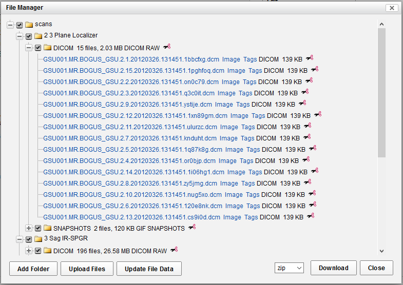 If you need to download individual scan or resource files attached to an XNAT Image Session, you can browse the XNAT file system by clicking "Manage Files" in the Actions menu of the image session report page. A popup will open with a file explorer in it.