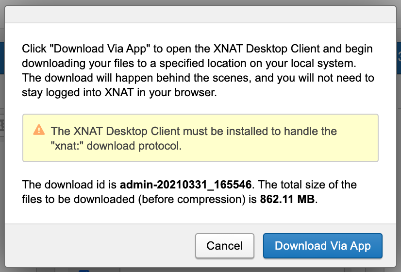 XNAT can download image resource files directly to your desktop without the use of an external application, if desired. The XNAT server will stream each resource file into a single ZIP file, which downloads to your local computer. When the user submits the data request, XNAT parses the XML catalog entries for each of the selected scan resources and generates a manifest that lists each file that is being requested for download. The user is shown a dialog that contains a "download ID", along with an estimate of the download size.