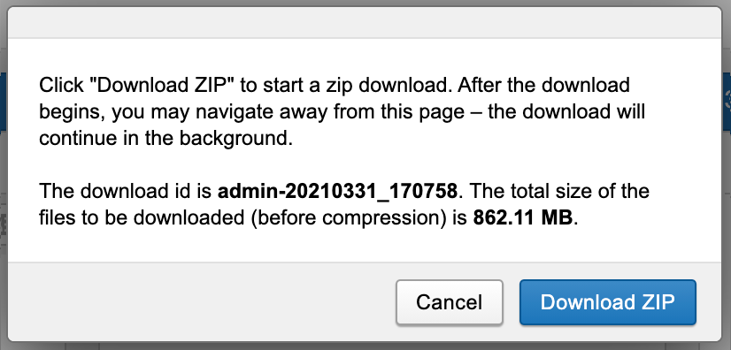 The performance or viability of streaming ZIP downloads will be constrained by the size of your selected data, your XNAT server's available memory, and your local storage. We recommend caution when selecting data to download via this method.