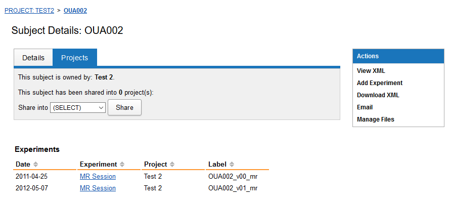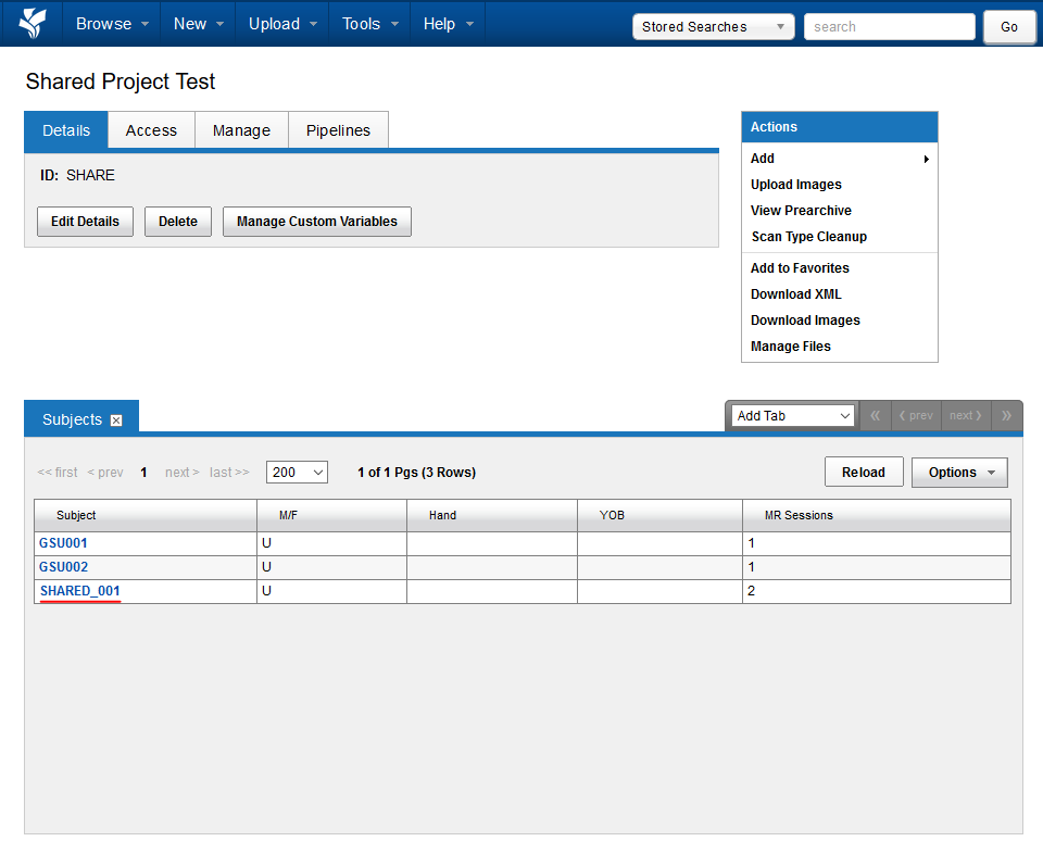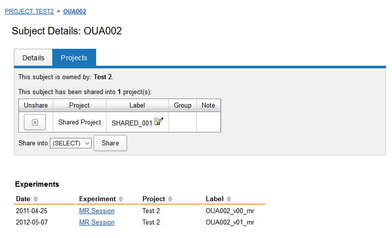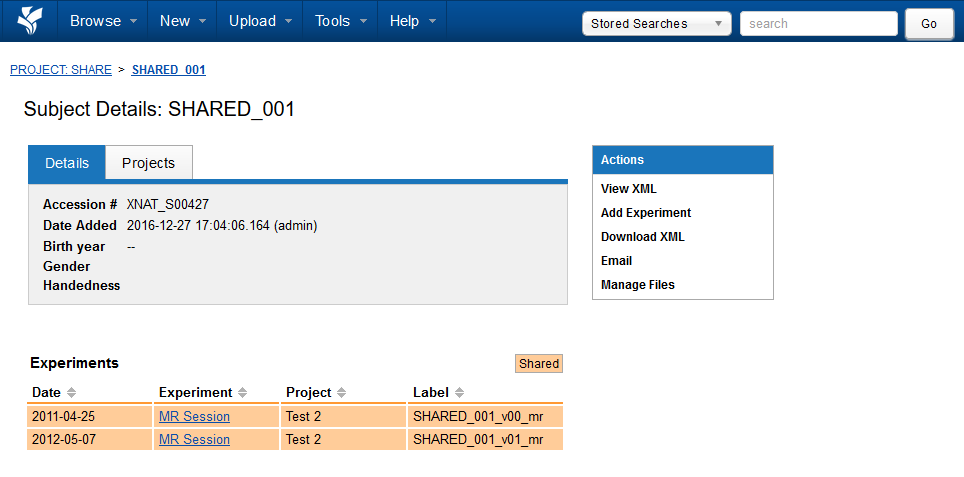 You can add new experiments or image assessors to this subject within this shared project, and your newly added data will belong to your destination project. For more information, see Understanding Data Sharing in XNAT's Security Structure.