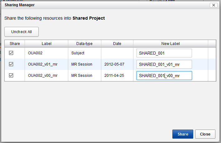 2. A Sharing Manager modal window will open, allowing you to select which experiments you wish to share along with the subject. You can also relabel the subject and its experiments as you wish. You cannot fundamentally alter the relationship between the subject and its experiment, for example, by trying to "share" an experiment from one subject in a source project to a different subject in a destination project.