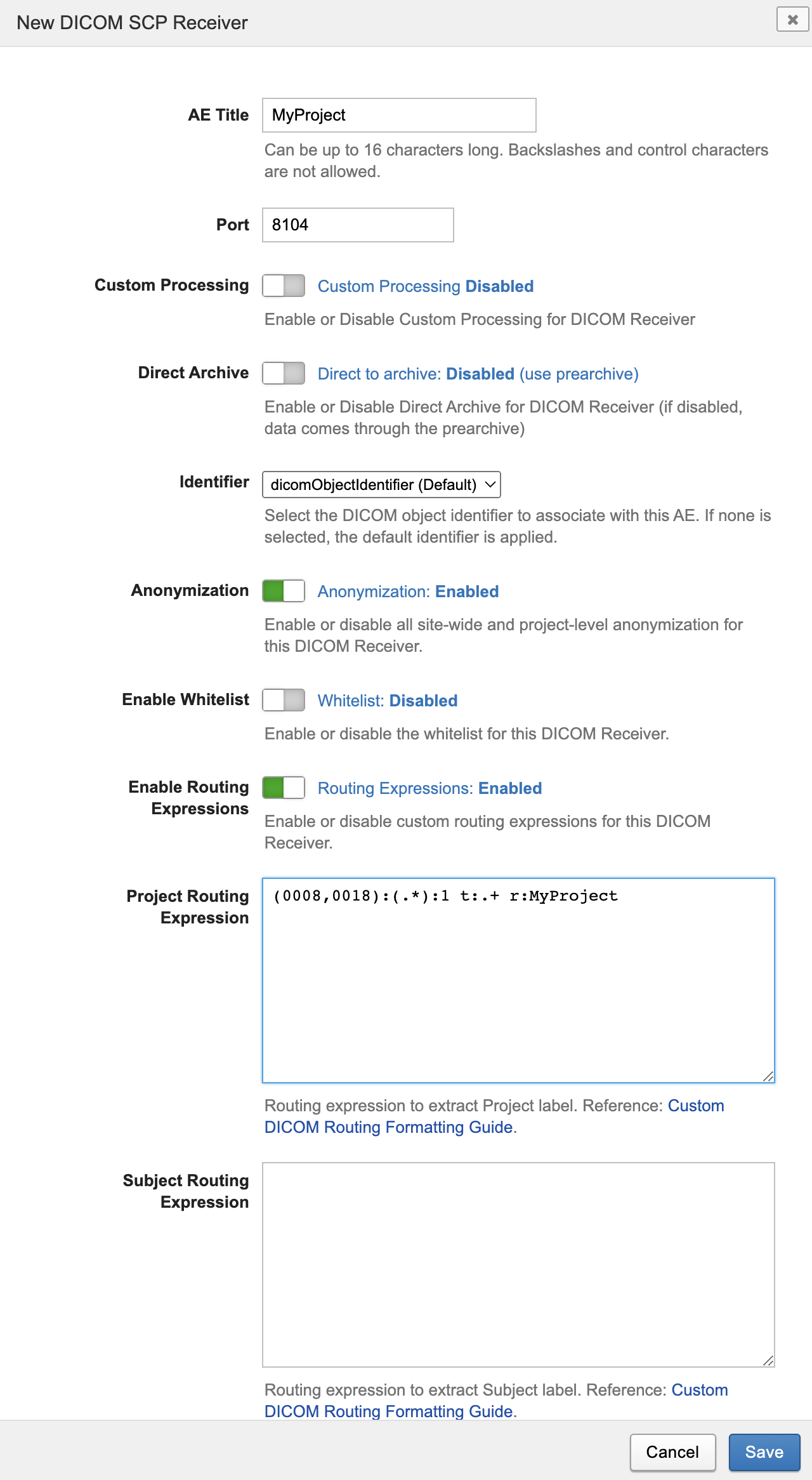 All DICOM sent to AE Title "MyProject" on port 8104 will be routed to Project "MyProject". Note that Subject and Session Routing Expressions are left blank. In this case the standard routing rules for Subject and Session will apply. Adding expressions here can provide other behavior as desired.