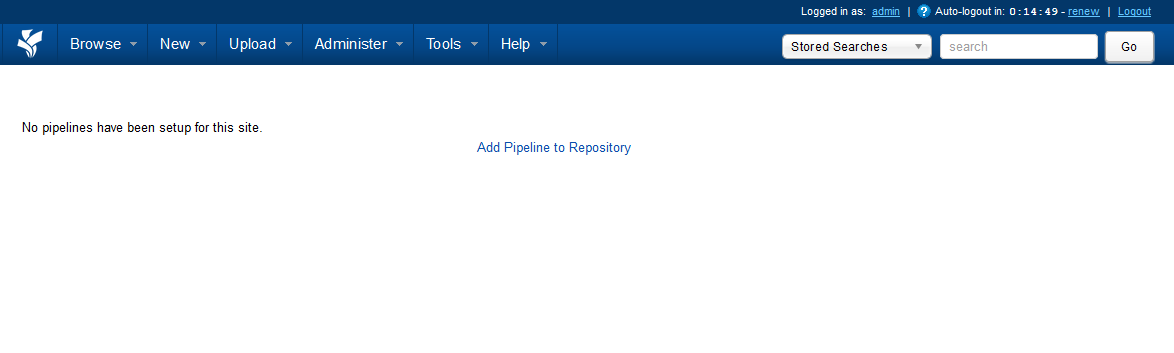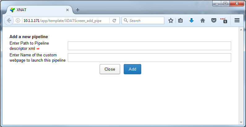To register pipelines in your XNAT pipeline repository, go to Administer > Pipelines. If you are working on a brand-new XNAT with no pipelines installed, you will see a screen like this. Click the "Add Pipeline to Repository" link to get started. A popup window will open.