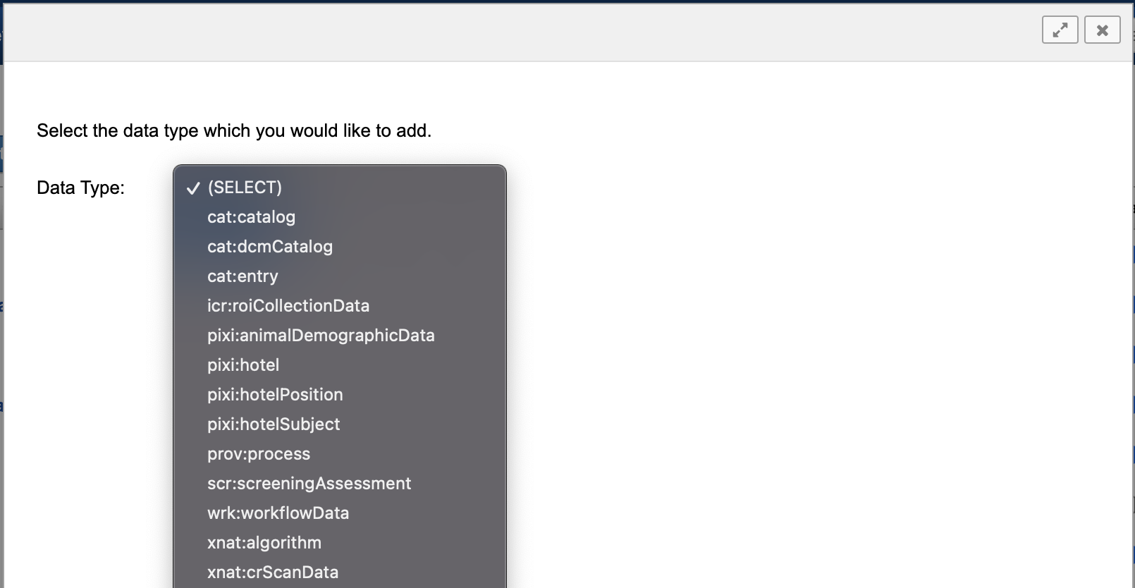 If your desired data type is not included in this list either, you can either write your own data type schema, or try to find an existing one in the XNAT Marketplace.