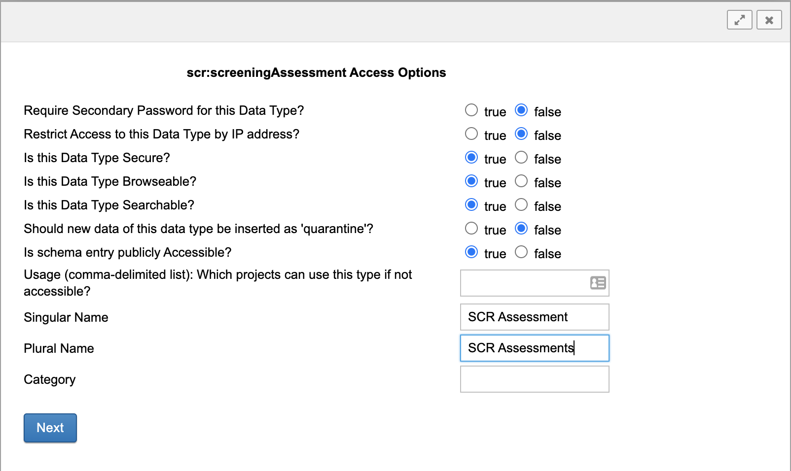- Is Data Type Secured: You will typically want your data types to be secured. When a user account attempts to query/retrieve data for a secured data type, XNAT will review the Primary Security Fields, xdat:user and xdat:userGroups to determine if they have access to see that data.