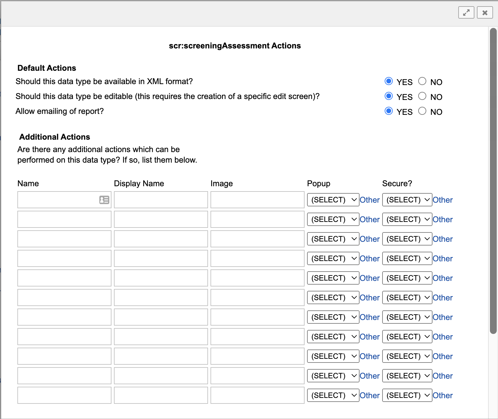The final screen of the wizard allows you to customize the actions for your new data type. Once again, the defaults should be appropriate most of the time. Adding new actions requires related backend development. See XNAT Data Type Development for details.