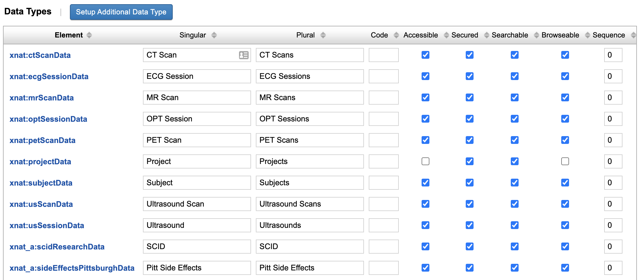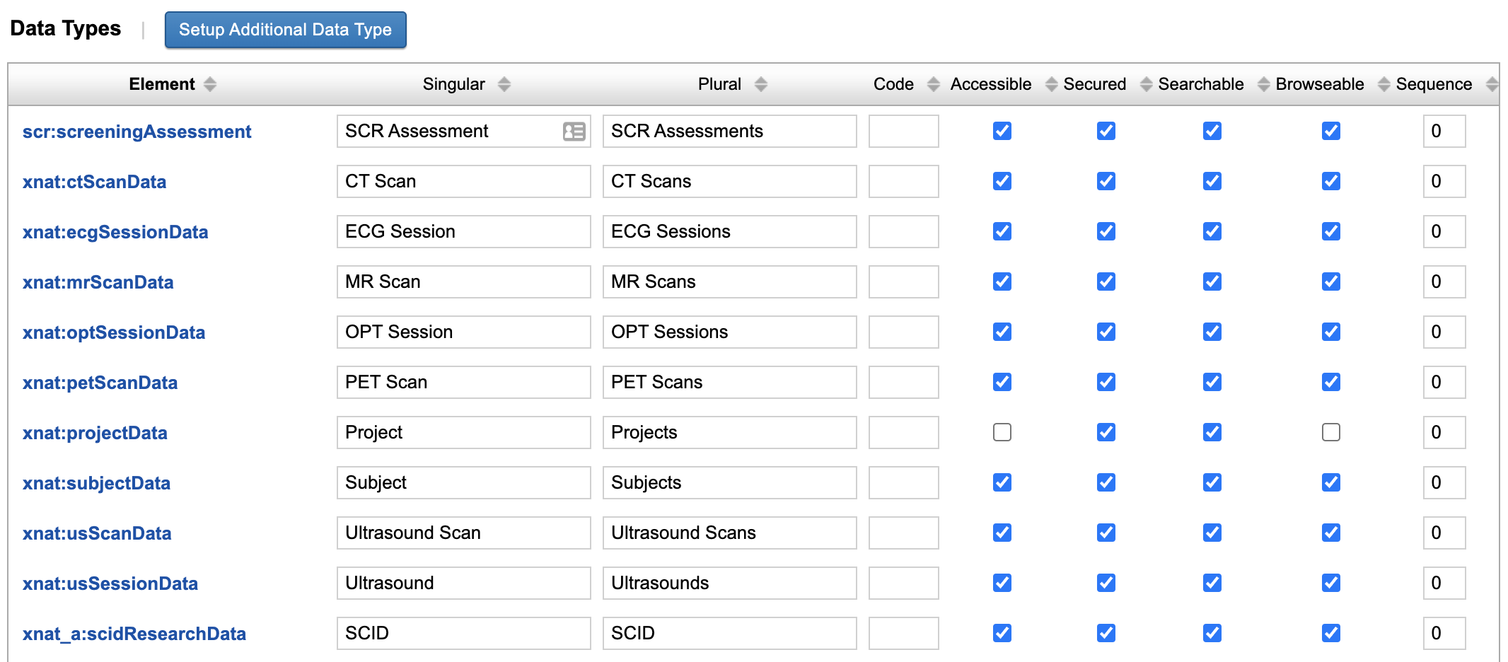 - Is Data Type Browseable: This determines whether this data type will get a listing in the "Browse > Data" top navigation, as well as in project pages. Every experiment or imaging assessor should be browseable.