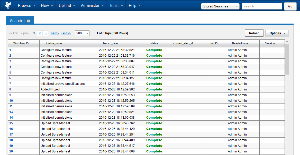 This data table is powered by a stored search that is automatically generated by XNAT. You can right-click on the pipeline_name column to set a filter for specific pipelines, and/or click on the Userfullname column to set a filter on a specific user. You can also save these modified data tables out as separate stored searches for future reference.