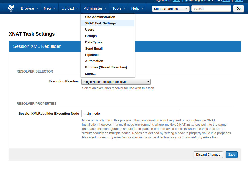 That's all that file needs to contain. If presence of a node-conf.properties file after a Tomcat restart indicates you are operating in a multi-node environment, site-admin users will see an XNAT Task Settings item under the Administer tab. This item and the resulting page is shown in the screenshot below: