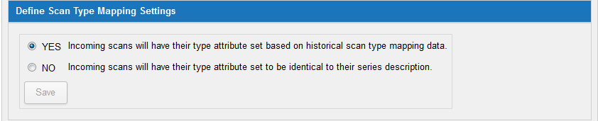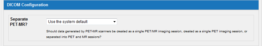 This controls whether data generated by PET-MR scanners are created as a single PET/MR imaging session, created as a single PET imaging session, or separated into PET and MR sessions. To change this simply select your desired option and click 'Save'. If no option is selected, it will default to the site-wide setting.