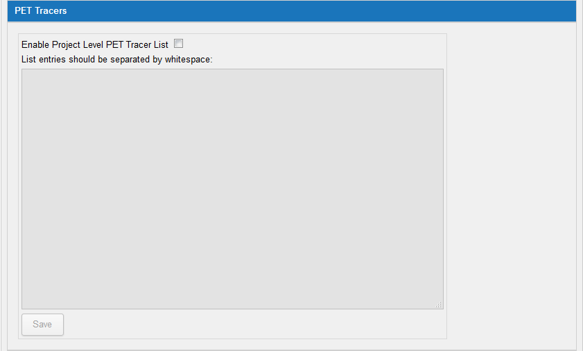 This panel controls whether to enable a project-specific list of accepted PET Tracers. When users upload PET Sessions using the Image Session Uploader, they can select a tracer from this list and that value will be stored as a session modifier.