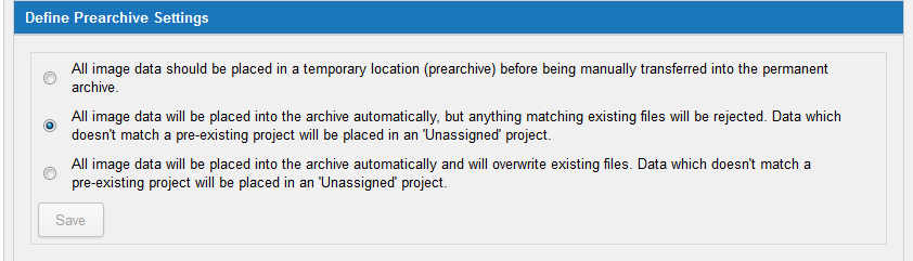 The Prearchive is a file system intended for temporarily housing incoming data files outside of the XNAT Archive. All uploaded image data can be placed into the Prearchive, where you can examine the DICOM headers for PHI, or for proof that the session upload is complete, before archiving the data into your project. There are three possible settings.