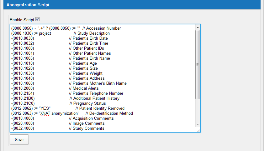 If you plan on importing a number of image sessions from the same scanner, it should be easy to browse the DICOM fields and identify fields that will have PHI in them. ("Should" be easy, but often is not, when you consider some scanners' proprietary tags and hard-to-find fields.) You use DicomBrower to browse and edit DICOM fields on existing sessions. But if you want to prevent any future scans from this same source from bringing PHI into your system, you can write an anonymization script using DicomEdit and apply it to your project in this panel. See How to Write an Anonymization Script.