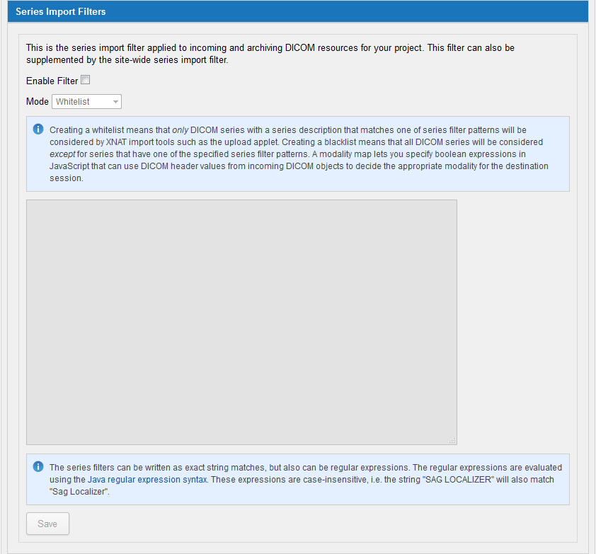 With series import filters, you can direct XNAT to prevent certain data from ever entering your archive. One very important reason to do this might be that your are uploading clinical images to a research project. Clinical images often contain "burned-in PHI," meaning that the image itself (as opposed to the DICOM headers) contains PHI such as Patient Name, Patient ID, etc. You might find this information in an actual image or possibly scanned documents that are also part of the session.