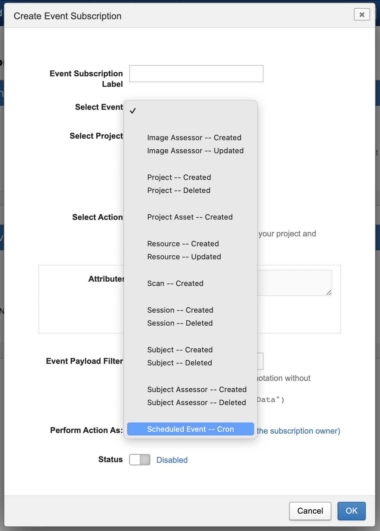 If the subscription's action is a container service command, the command must have an external input that is supported by Scheduled Events. Inputs that are currently supported are Project, Project Asset, Subject, Subject Assessor, Session, and Assessor. Commands that don't have a supported external input will not be processed by the subscription.