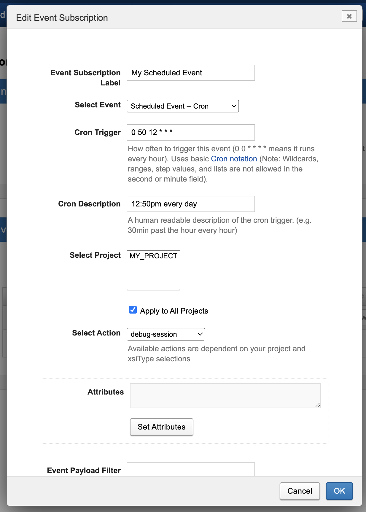 In the example below, the debug-session command will run on all sessions in all projects at 12:50pm everyday.
