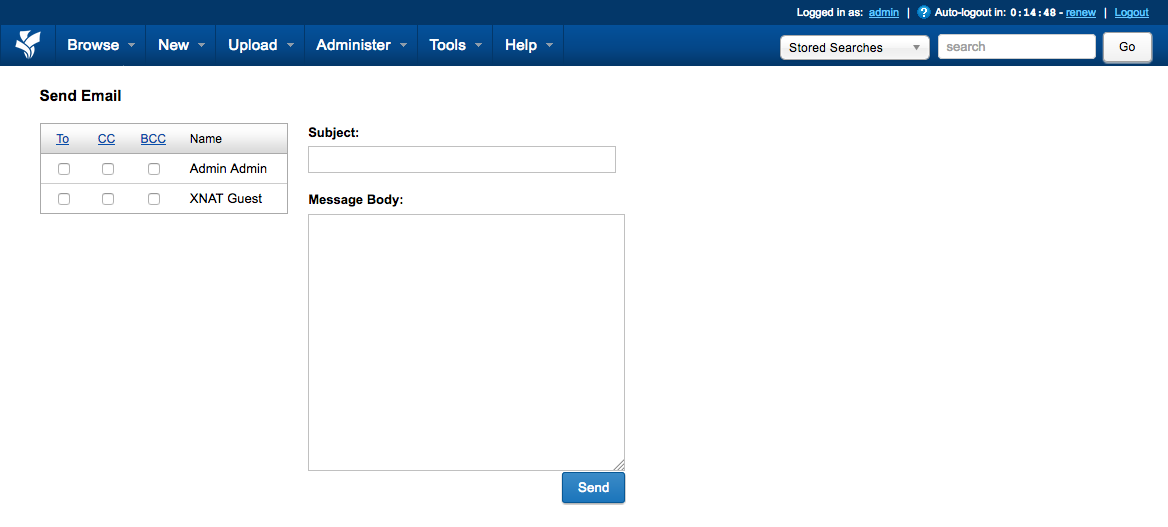 XNAT provides a bare-bones interface for sending email alerts to one or more registered users. This can be accessed by site administrators at Administer > Send Email.
