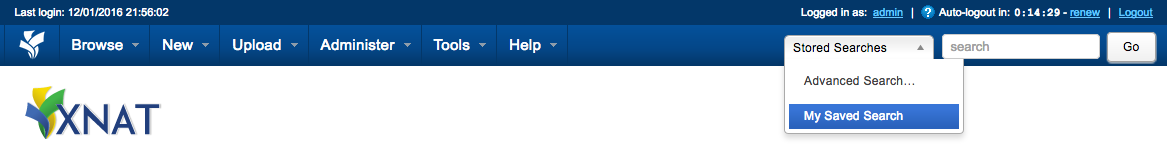 Stored Searches are also referred to as bundles in the XNAT Admininstration UI. These are searches that other users are allowed to view. They are a useful tool for organizing subsets of data into easily viewed combinations. The definition of each bundle is stored in the database in the same manner as your data. The bundles are loaded into the application server's context when they are first requested. Each bundle has a list of users who are allowed to view it. These users will have a link to the bundle in their navigation menu.
