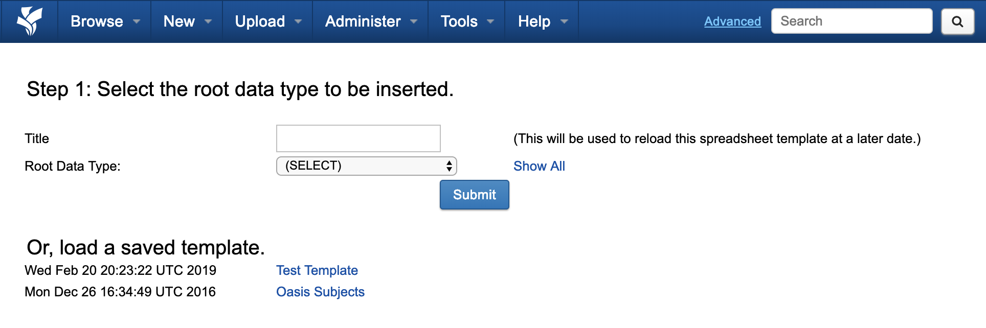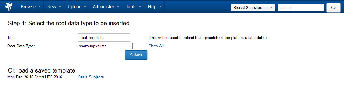 5. Click Submit. This will create and save a CSV upload template in your user cache in the XNAT file system.