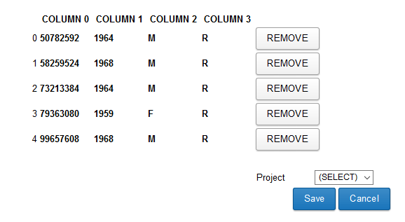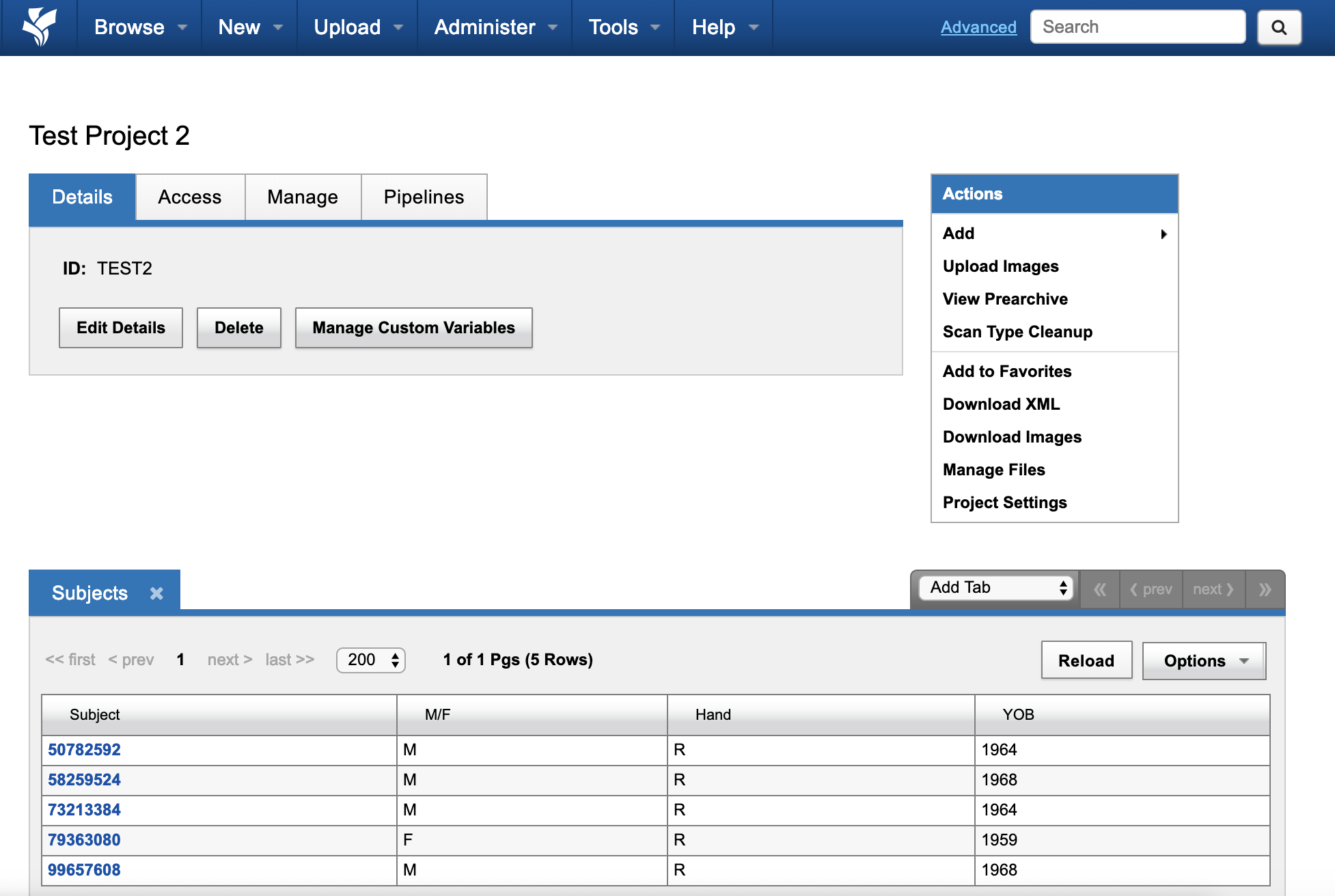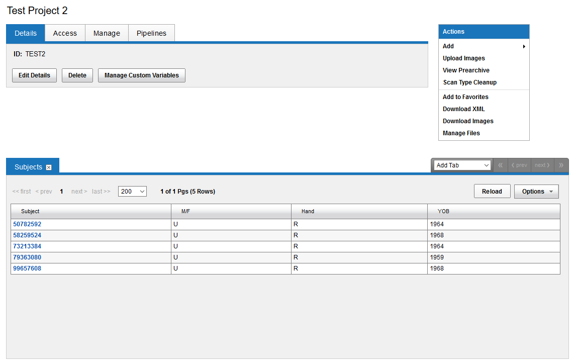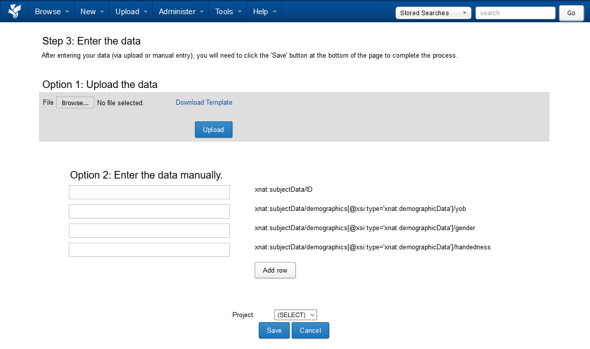 In this demo, we are uploading subject demographic data from the mBIRN_calib project on XNAT Central. You can download the example CSV spreadsheet file here: csv-upload-raw-data.csv